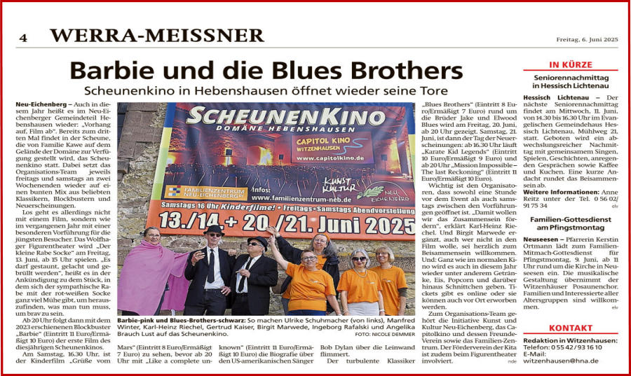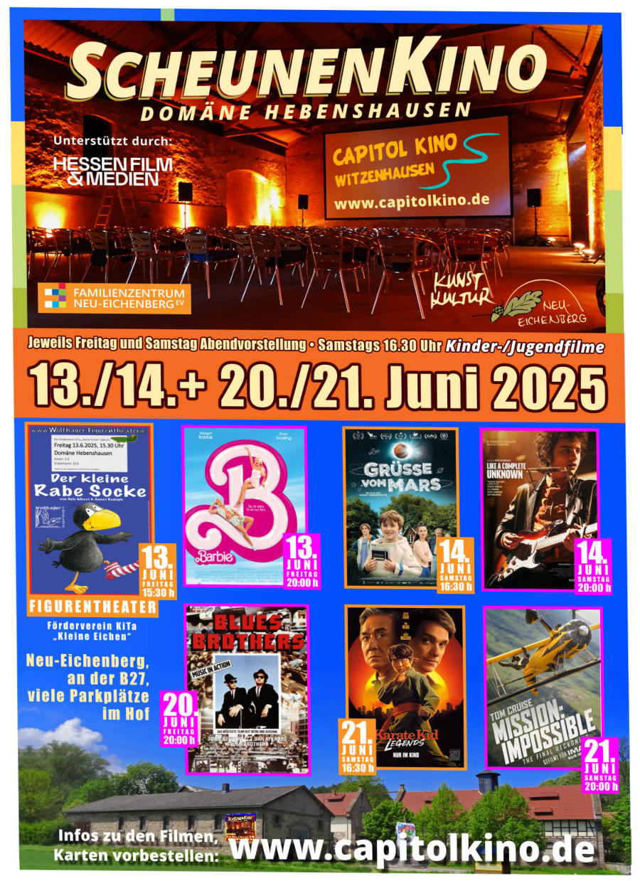13./14.+ 20./21. Juni 2025, jeweils Freitag und Samstag, Adresse Neu-Eichenberg, Domäne 1, viele Parkplätze im Hof • Infos zu Filmen, Eintritt, Kartenvorbestellungen beim Capitolkino Witzenhausen:www.capitolkino.de Wie 2024, die Jüngsten eröffnen am ersten Freitag um 15:30 Uhr das Programm. „Der kleine Rabe Socke“ erscheint für sie nicht im Film sondern höchst lebendig auf der Bühne des Wolfhager Figurentheater. Bühne frei 2025. Es darf gestaunt, gelacht und gebrüllt werden! Der Förderverein KiTa „Kleine Eichen“ lädt ein. – Danach weckt die große Leinwand Sinne und Emotionen. Starke und populäre Filme, das stimmungsvolle Ambiente der Domäne machen wieder Lust auf SCHEUNENKINO HEBENSHAUSEN. Hier darf der Filmabend zu einer Mitsommerparty werden. Gekühlte Getränke und kleine Speisen laden zu verweilen. – Dank der Familie Kawe als Gastgeber. Mit Ihr teilen wir den Wunsch, die Scheune möge immer wieder voll werden. Das Team von Capitolkino Witzenhausen und Kunst und Kultur Neu-Eichenberg freut sich auf Ihren Besuch. • Begleitende Infos unter www.familienzentrum-neb.de