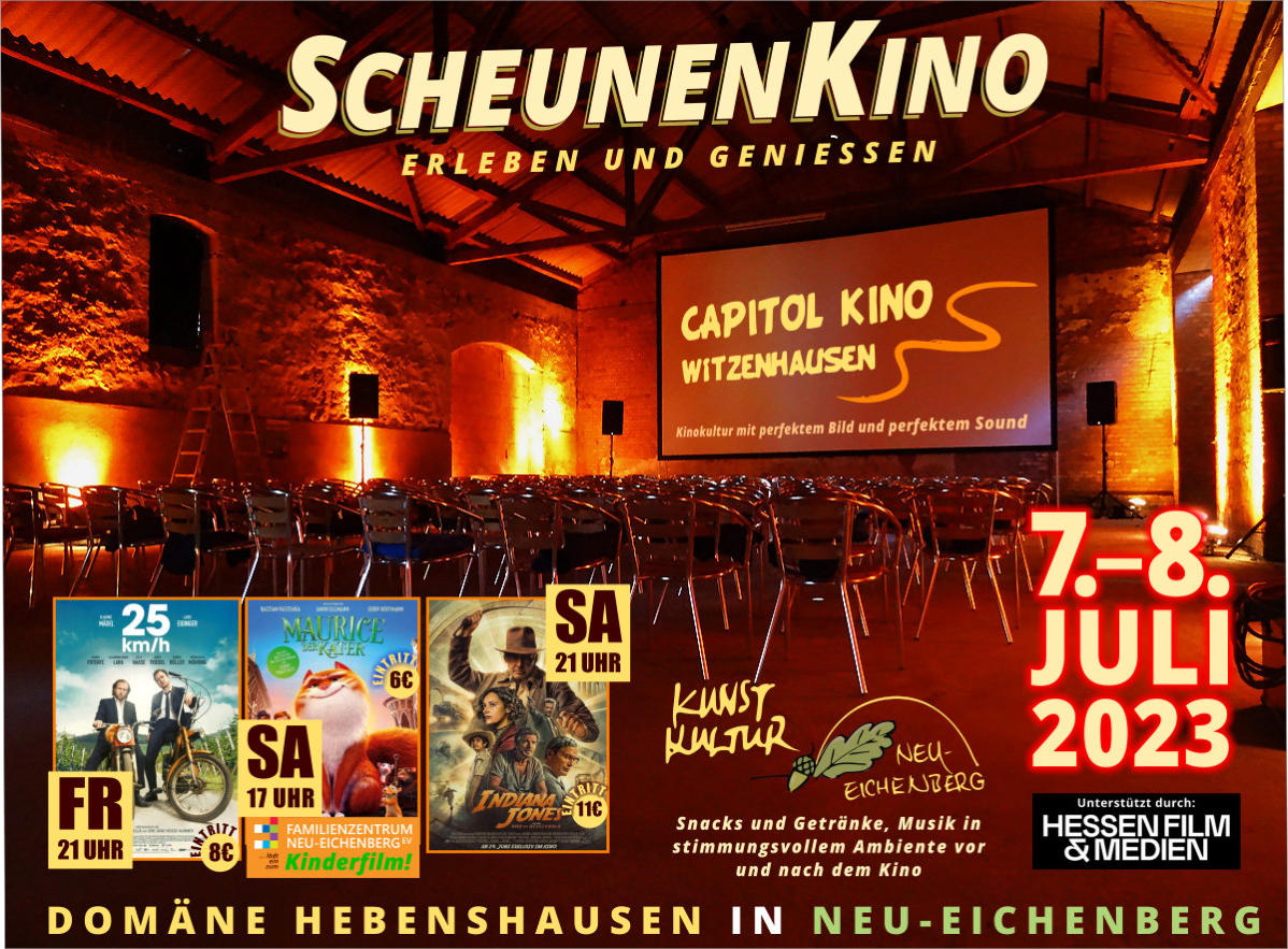 Freitag/Samstag, 7./8. Juli 2023 • Neu-Eichenberg auf der Domäne Hebenshausen • Unterstützt durch HESSENFILM & MEDIENPremiere für Scheunenkino in Neu-Eichenberg. Es war gleich zum Start ein Erfolg. Die Abendvorführungen waren ausverkauft. Zum Kinderfilm kamen am Filmnachmittag trotz Sommerhitze über sechzig kleine und große Trickfilmfans. Das Capitol-Kino bot Kinokultur vom Feinsten, Kunst+Kultur hat mit angepackt und für ein stimmungsvolles Ambiente gesorgt. Es wurde sogar gefragt, ob man auf der Domaine Hebenshausen ab jetzt heiraten könnte. – Dank an das Publikum für die spontane Begeisterung, für die Unterstützung der Behörden, der Freiwilligen Feuerwehr Neu-Eichenberg und dem Leierkastenmann! •Bildergalerie Scheunenkino Neu-Eichenberg