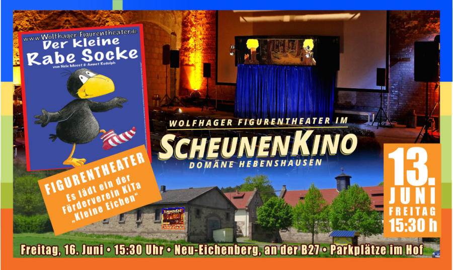 Freitag, 13.06.2025, 15.30 Uhr, Scheunenkino Hebenshausen Das Scheunenkino Hebenshausen eröffnet mit einem besonderen Event für die Jüngsten. Wie im letzten Jahr lädt der Förderverein KiTa „Kleine Eichen“ ein zum Figurentheater. Es spielt das Wolfhager Figurentheater „Der kleine Rabe Socke“. Rabe Socke will es wissen: Alles erlaubt oder immer schön brav? Ausprobieren ist besser als ausdenken. Der kleine Rabe wünscht sich ein „Nix-ist-verboten-Fest“. Da wollen alle seine Freunde aus dem Wald dabei sein. Wir dürfen mit feiern und gespannt sein, was passiert! • Eintritt: Kinder 5 € • Erwachsene 10 € • Tickets an der Tageskasse 30 Minuten vor Beginn • Mehr Infos beim Wolfhager Figurentheater